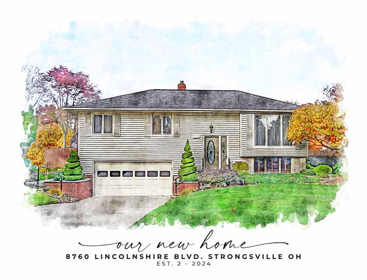 Custom watercolor home portrait of a charming suburban house surrounded by lush greenery, designed as a unique keepsake to celebrate the special bond with your home. Perfect as a personalized housewarming gift or a memorable anniversary present.